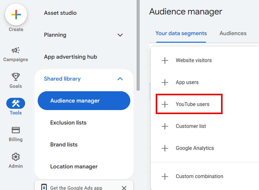 To set up YouTube remarketing lists, navigate to Tools > Shared Library > Audience Manager.