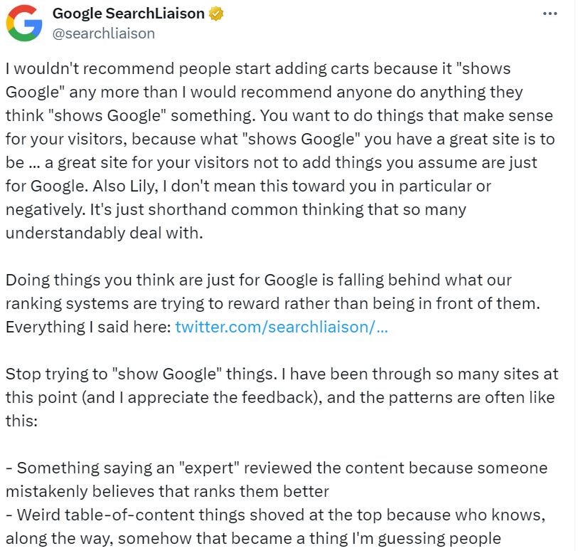 One point in question on X (Twitter) was things like author bios, publish dates, or table of contents. Whether Google’s system actively looks for and rewards them or users prefer them, they have a positive impact.
