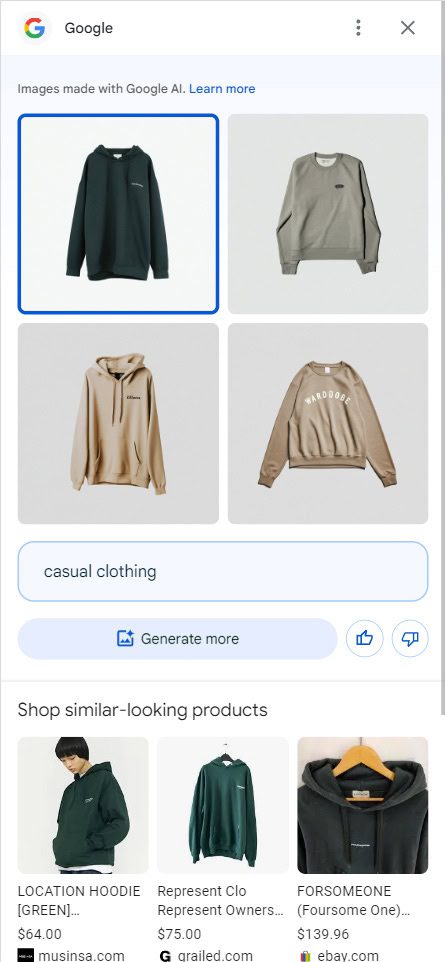 Google now tests “generate image with AI,” a feature that lets users generate product images with prompts and then see similar (real) products.